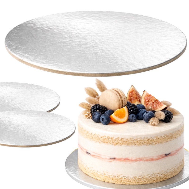 Okrągłe podkładki pod tort w eleganckim, srebrnym kolorze dodadzą Twoim wypiekom profesjonalnego wyglądu. Lustrzany połysk pięknie odbija światło i podkreśla dekoracje na torcie czy cieście.
