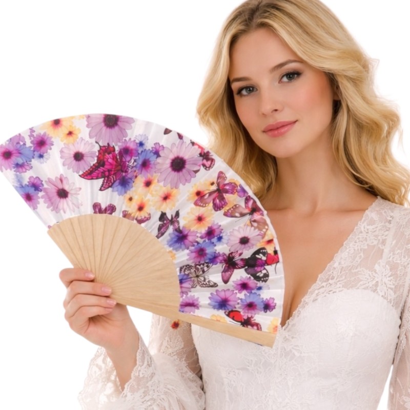 Wachlarz materiałowy w kwiaty i motyle to subtelny akcent, który dodaje charakteru zarówno eleganckiej sukni, jak i letniej, codziennej stylizacji.