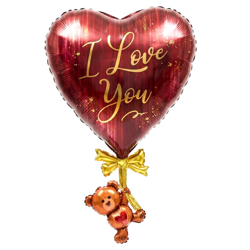 Przedstawiamy elegancki balon foliowy w kształcie serca, ozdobiony złotym napisem 'I Love You' oraz uroczym misiem. Ten wyjątkowy balon to doskonały sposób na wyrażenie uczuć, idealny na walentynki, urodziny lub jako romantyczny gest bez okazji.
