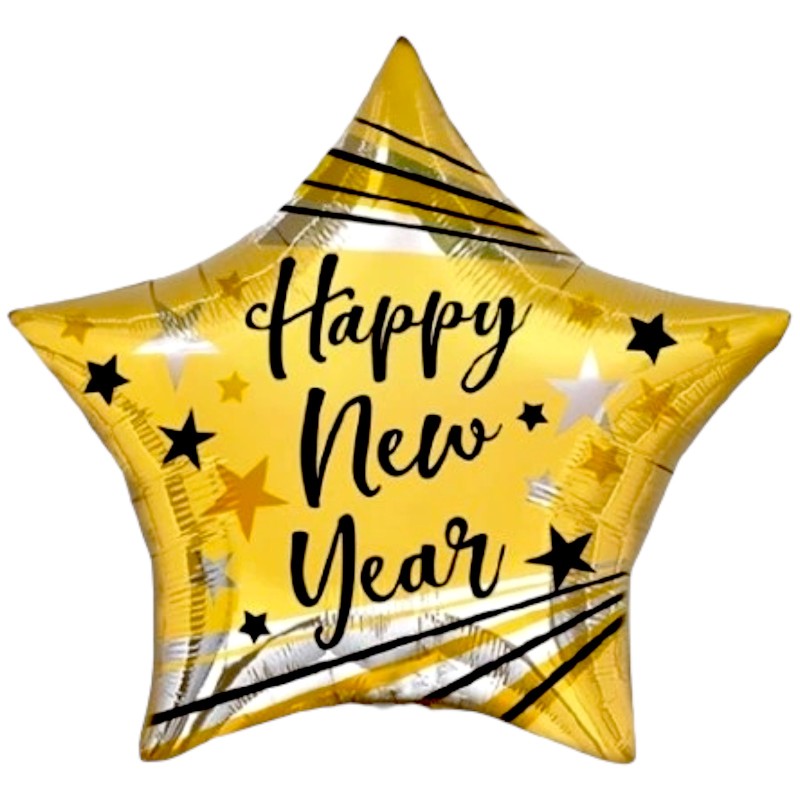Elegancki balon foliowy w kształcie złotej gwiazdy z napisem Happy New Year. Idealna dekoracja na Sylwestra, dodająca blasku każdej imprezie.