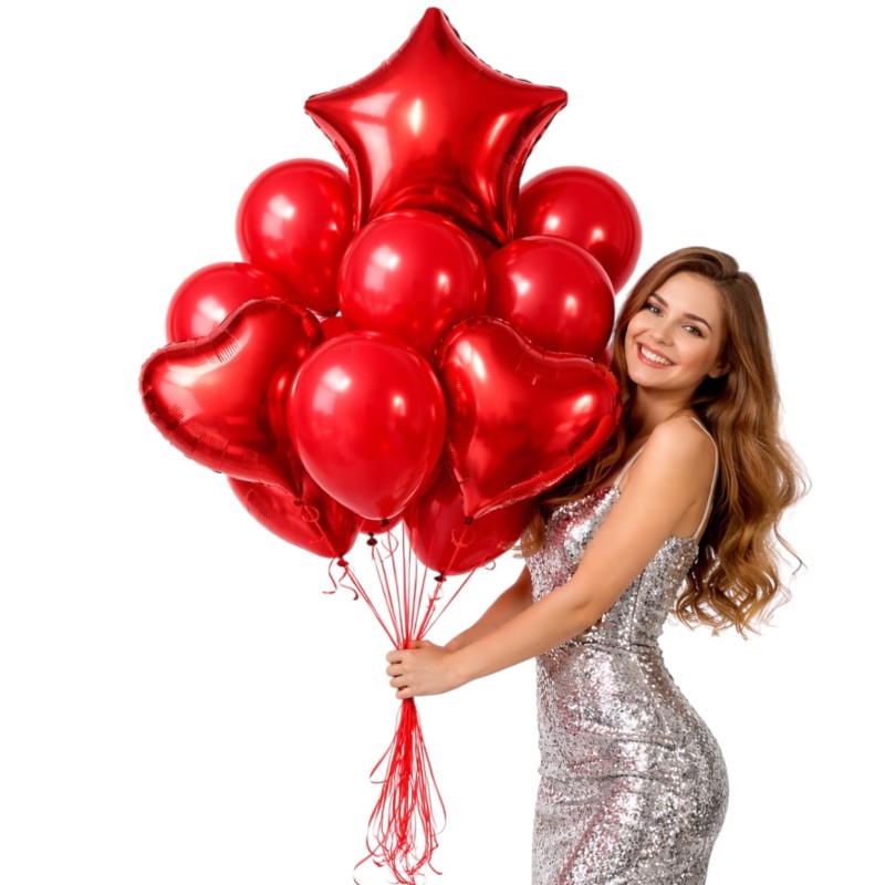 Stwórz niezapomnianą atmosferę dzięki naszemu bukietowi balonowemu. Zestaw zawiera 10 balonów w eleganckim czerwonym kolorze, w tym 2 balony foliowe w kształcie serca o średnicy 45 cm, 1 balon foliowy w kształcie gwiazdy o średnicy 45 cm oraz 7 balonów lateksowych. Idealne na Walentynki, romantyczne przyjęcia i inne wyjątkowe okazje.
