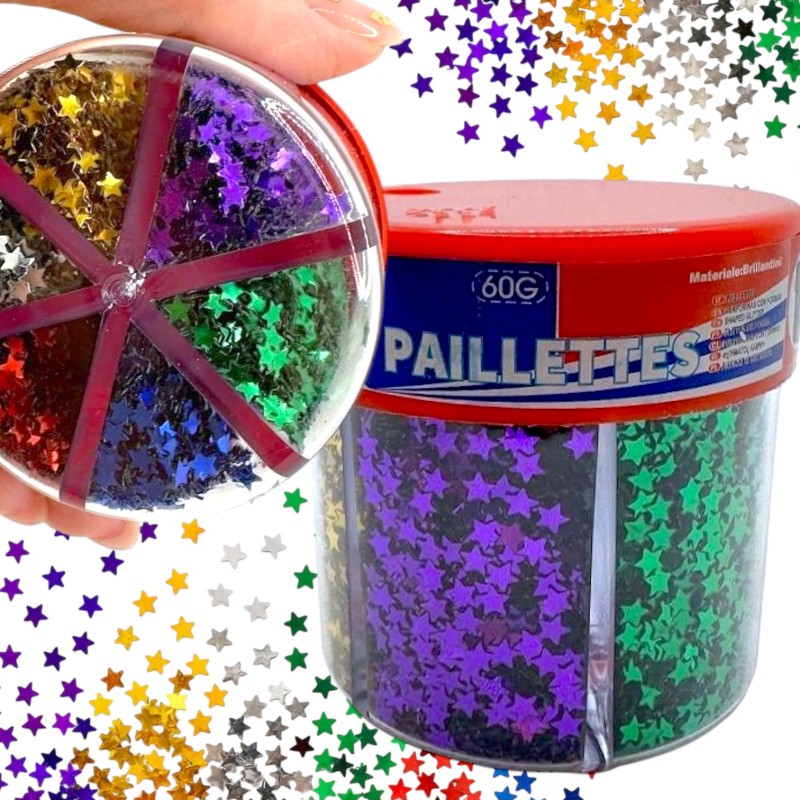 Wprowadź odrobinę magii do swoich projektów z naszym brokatem dekoracyjnym w kształcie gwiazdek. Zestaw zawiera 6 komór, które łącznie oferują 6 kolorów w jednym praktycznym opakowaniu. Dzięki specjalnemu dozownikowi możesz łatwo aplikować wybrany kolor.