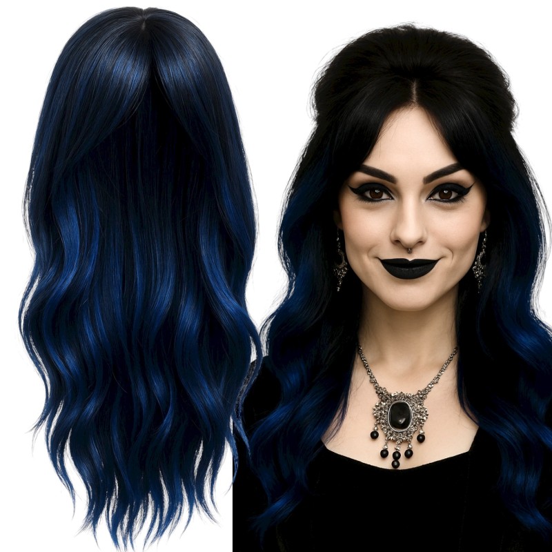 Ta wyjątkowa peruka to doskonały wybór dla miłośników stylizacji cosplay i gotyckich klimatów. Wykonana z wysokiej jakości materiałów, oferuje naturalny wygląd i komfort noszenia. Długie, falujące włosy w kolorach czerni i niebieskiego dodadzą każdej stylizacji charakteru i tajemniczości.