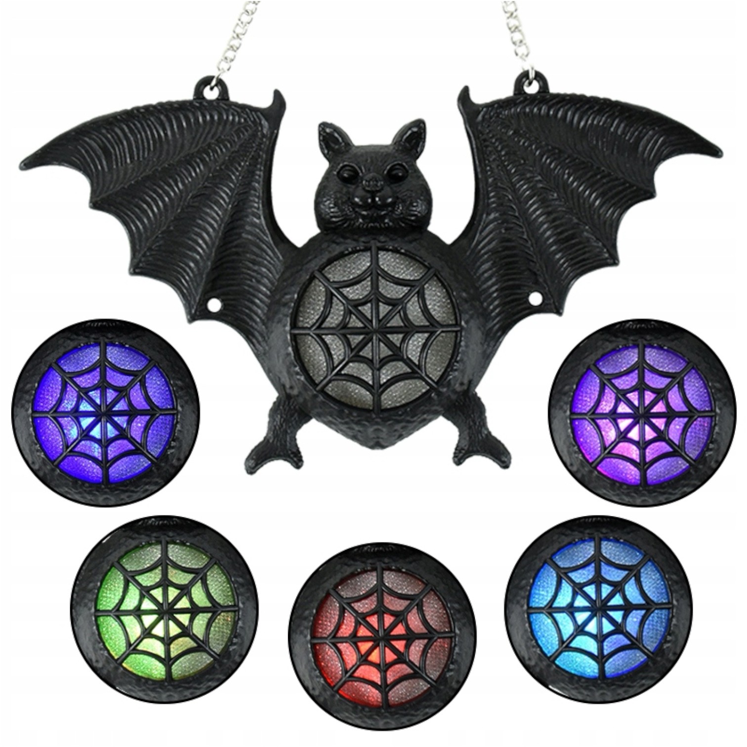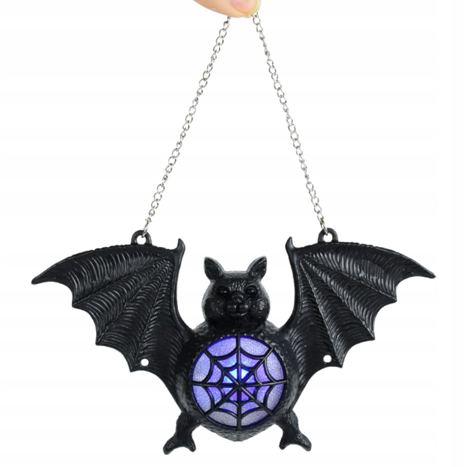 Dekoracja przedstawia nietoperza z rozłożonymi skrzydłami, którego korpus zdobi pajęczyna. W środku znajduje się wbudowane światło LED, które emituje delikatną, kolorową poświatę, tworząc magiczny i tajemniczy efekt.