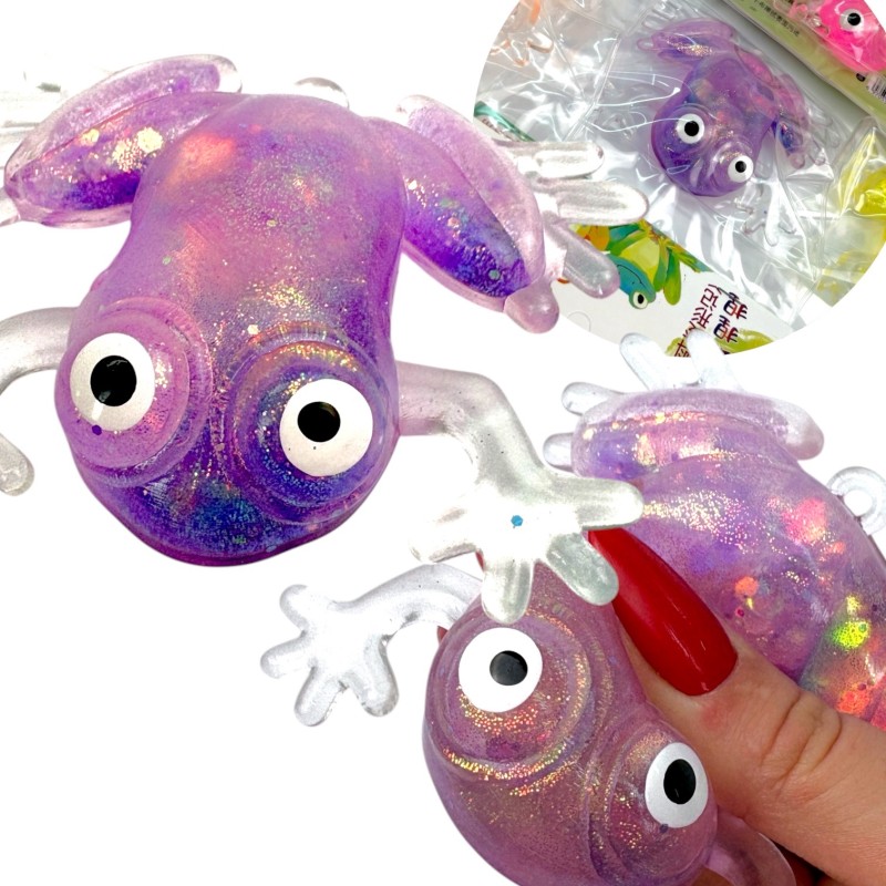 Urocza żabka gniotek, która mieni się brokatem przy każdym ściśnięciu. Miękka, lekko galaretowata w dotyku, z dużymi, zabawnymi oczami i półprzezroczystymi łapkami. To idealny fidget toy dla dzieci i dorosłych, którzy lubią sensoryczne zabawki i kolorowe gadżety.