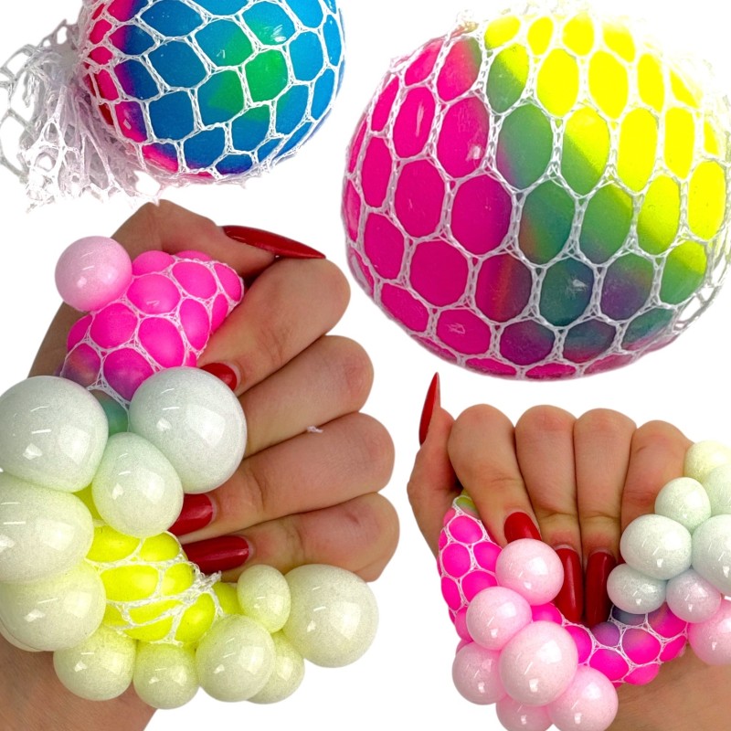 Kolorowa kula antystresowa, która po ściśnięciu wychodzi przez siatkę w postaci efektownych bąbelków. Intensywne, tęczowe barwy i miękka pianka w środku zachęcają do zabawy i pomagają się zrelaksować.