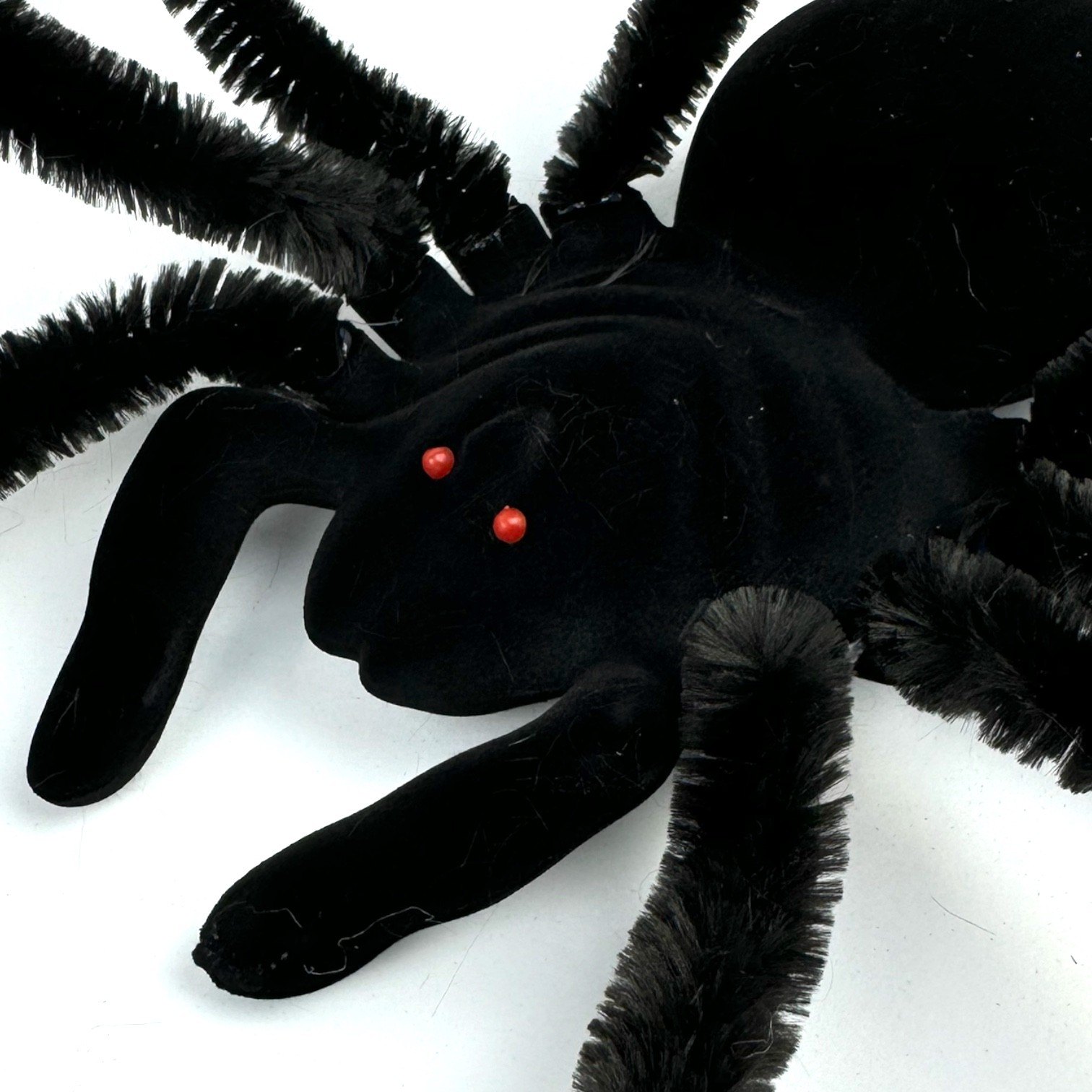 Pająk wykonany jest z pluszowego materiału, który imituje futro prawdziwego pająka, co nadaje mu realistyczny wygląd. Czerwone oczy dodają mu groźnego i mrocznego charakteru.
