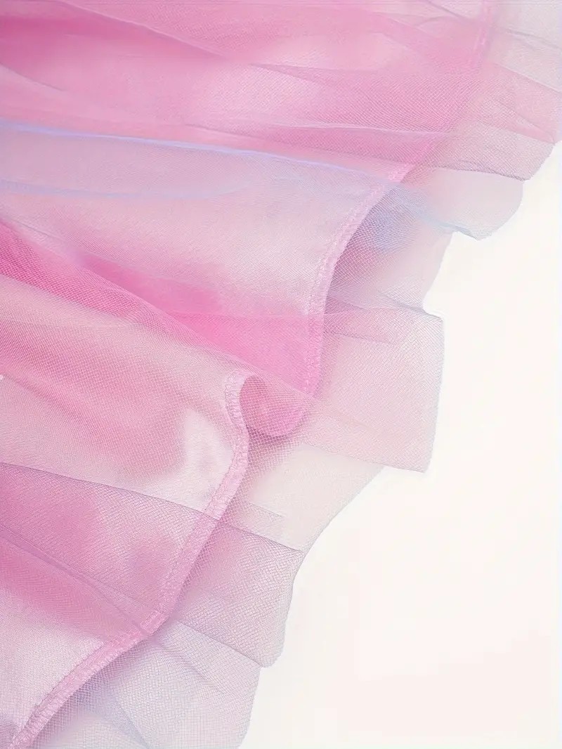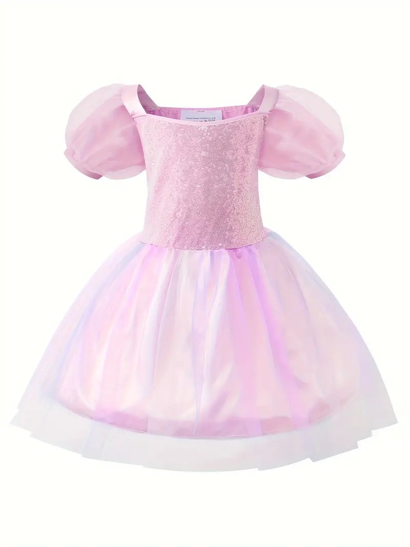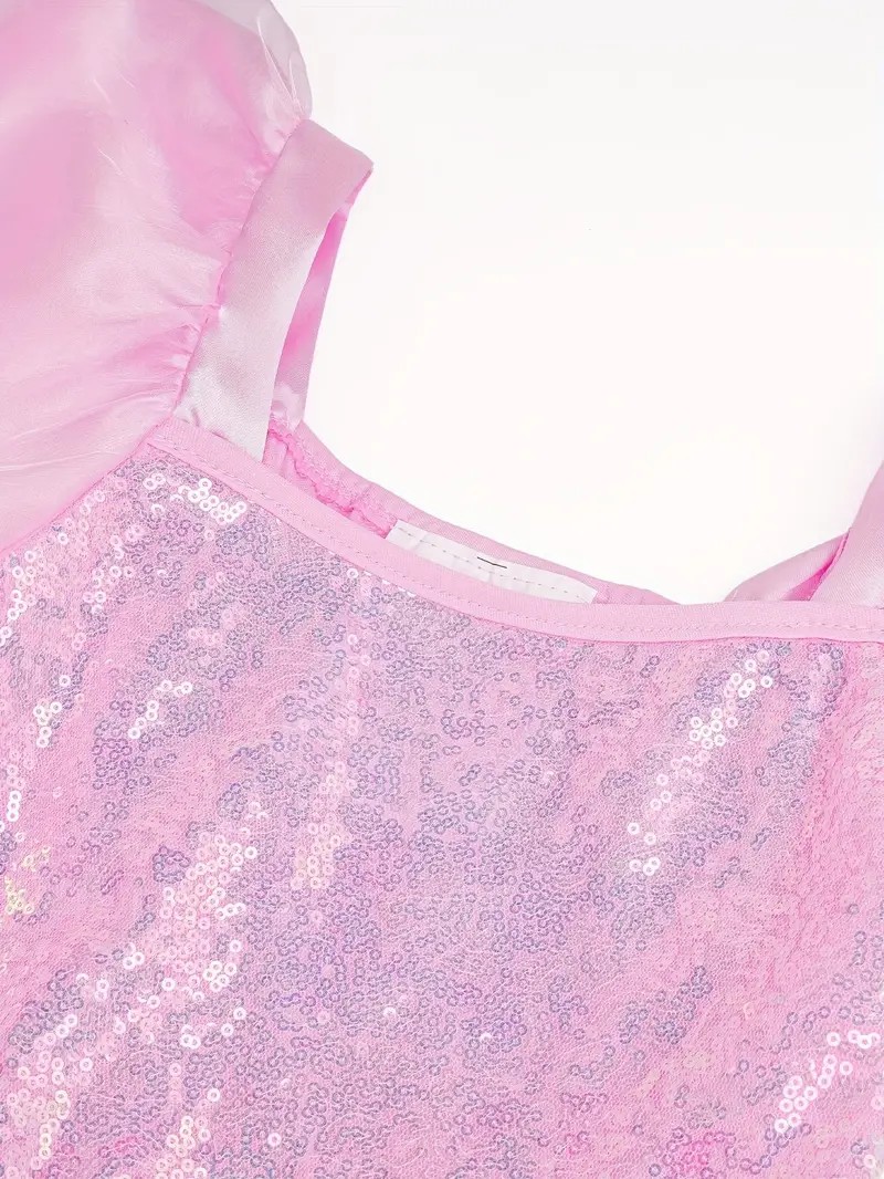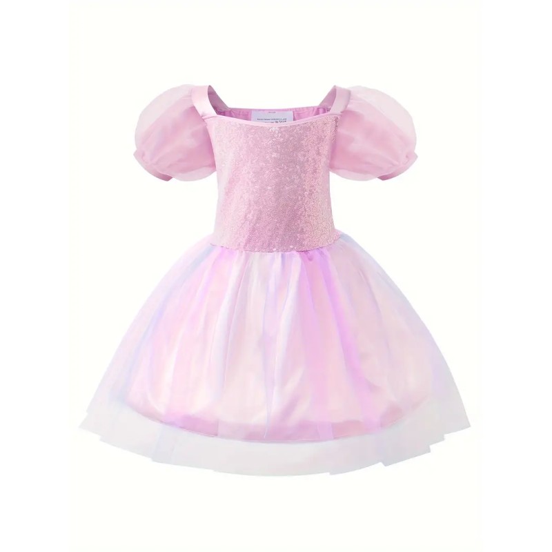 Każda sukienka ma błyszczący gorset z cekinami, bufiaste rękawki i wielowarstwowy tiulowy dół z efektem ombre, który nadaje kreacji lekkości i elegancji. Materiał jest aksamitny w dotyku, zapewnia wygodę podczas zabawy, a staranne wykończenie sprawia, że kostium wygląda jak prawdziwa suknia z bajki.