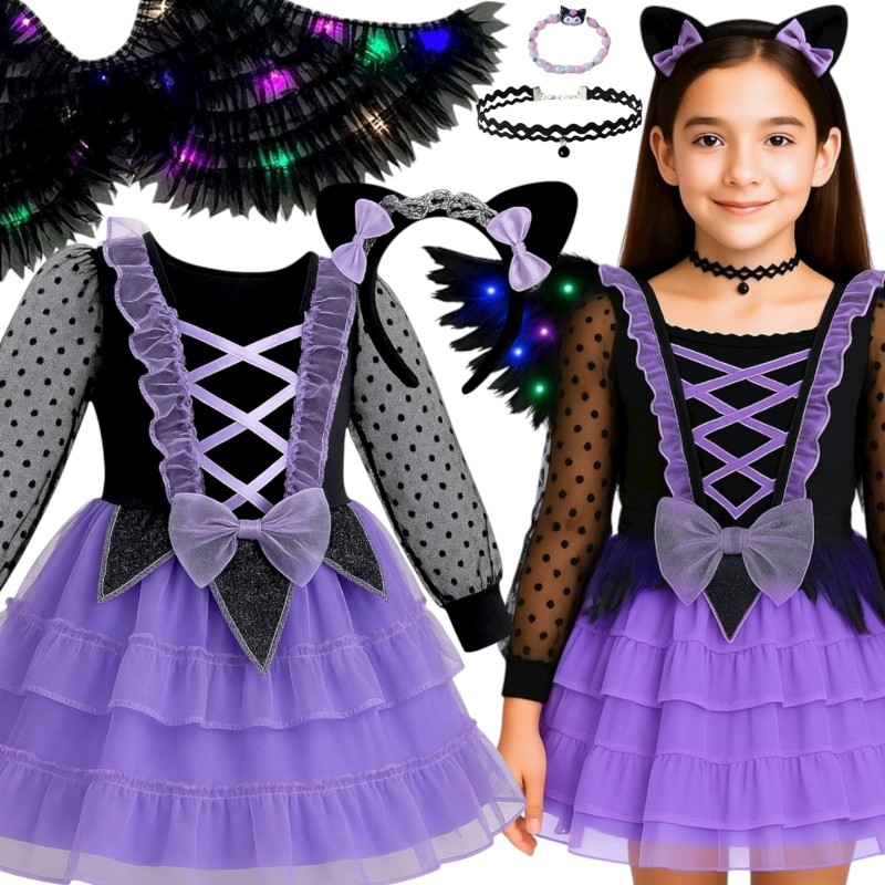 Zestaw Kuromi dla dzieci: elegancki strój z tiulową spódniczką, skrzydełkami, opaską i biżuterią. Idealny na przyjęcia i zabawy.