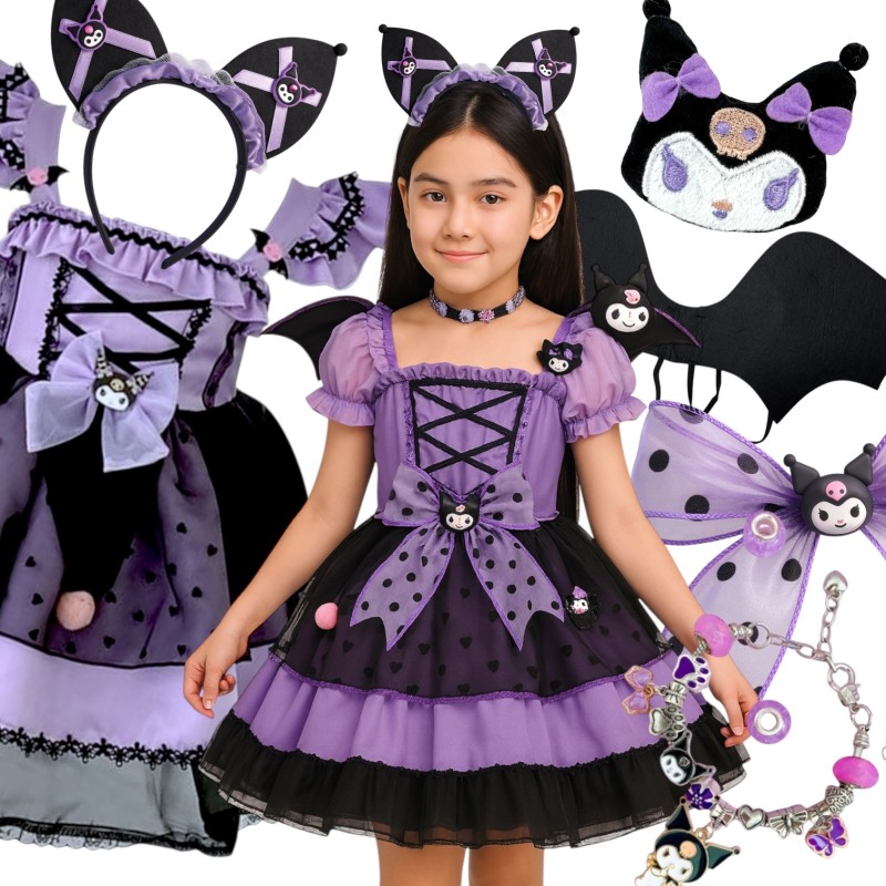 Uroczy strój Kuromi dla dziewczynek. Zestaw zawiera sukienkę, skrzydła, opaskę z uszami, kokardę i spinkę z maskotką. Idealny na karnawał i przyjęcia. Wysokiej jakości materiał, rozmiary dla dzieci od 3 do 12 lat.