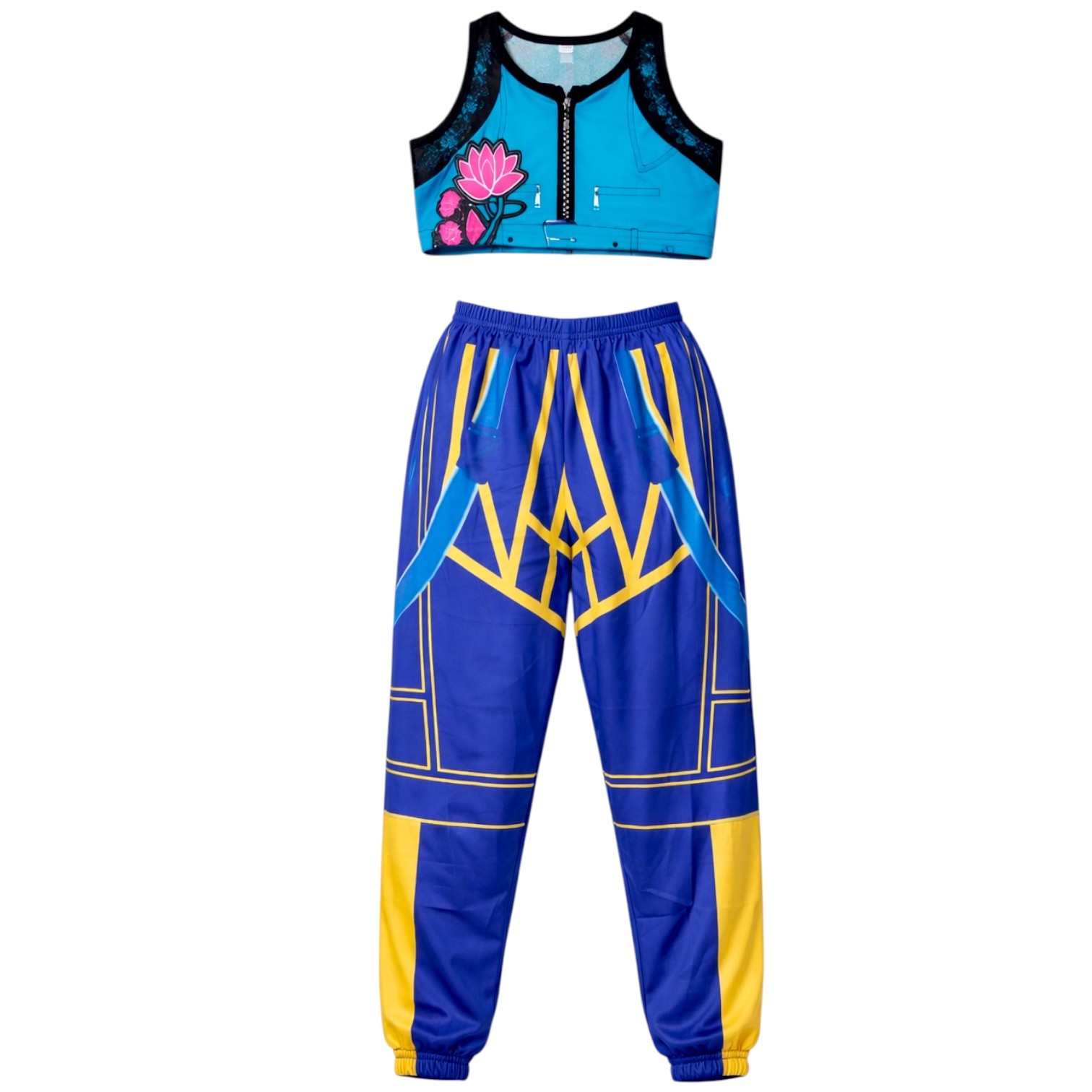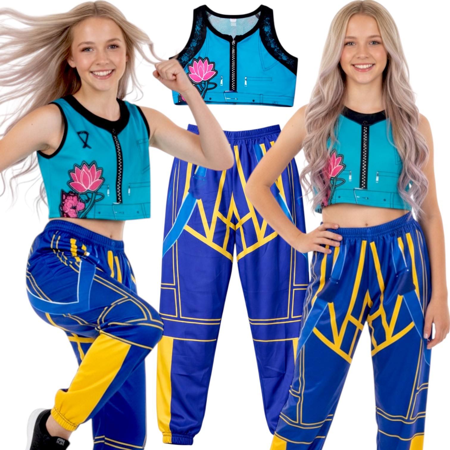 Efektowny strój Demon Hunters KPOP Zoey to propozycja dla dzieci inspirowana stylistyką cosplay oraz nowoczesnym, scenicznym wyglądem znanym z klimatu K-POP. Dwuczęściowy zestaw składa się z krótkiego topu oraz długich spodni z elastyczną gumką w pasie, co zapewnia wygodę noszenia i swobodę ruchów.