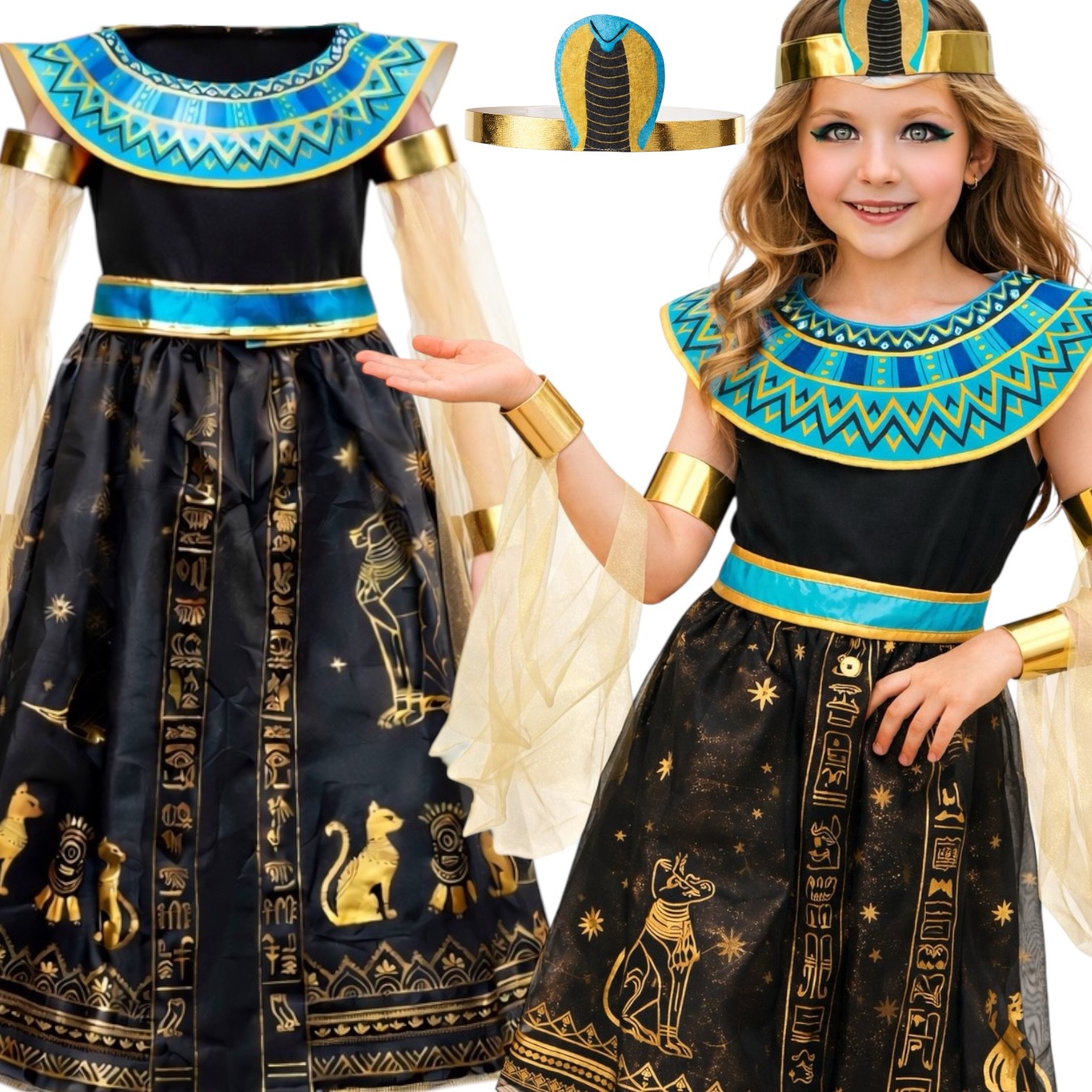 Efektowny strój egipcjanki inspirowany stylem Kleopatry to wyjątkowa propozycja dla dzieci, które marzą o królewskiej stylizacji z nutą starożytnego Egiptu. Czarna sukienka została ozdobiona złotymi motywami i egipskimi symbolami, które pięknie kontrastują z turkusowymi akcentami.
