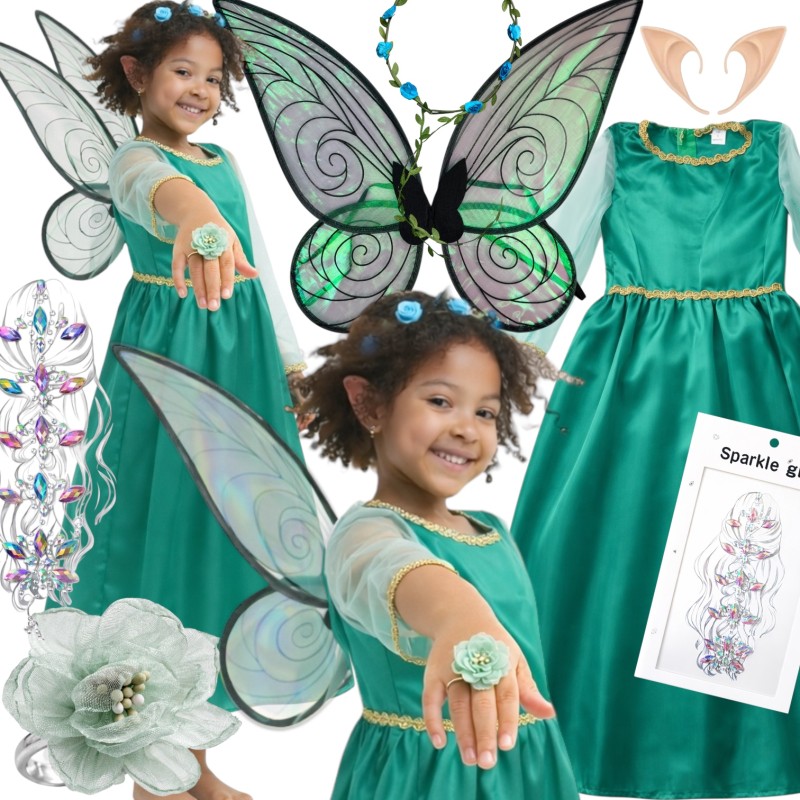 Zachwycający strój elfa wróżki dla dzieci, idealny na bale przebierańców i kreatywną zabawę. Zestaw zawiera suknię, skrzydła, wianek i uszka.