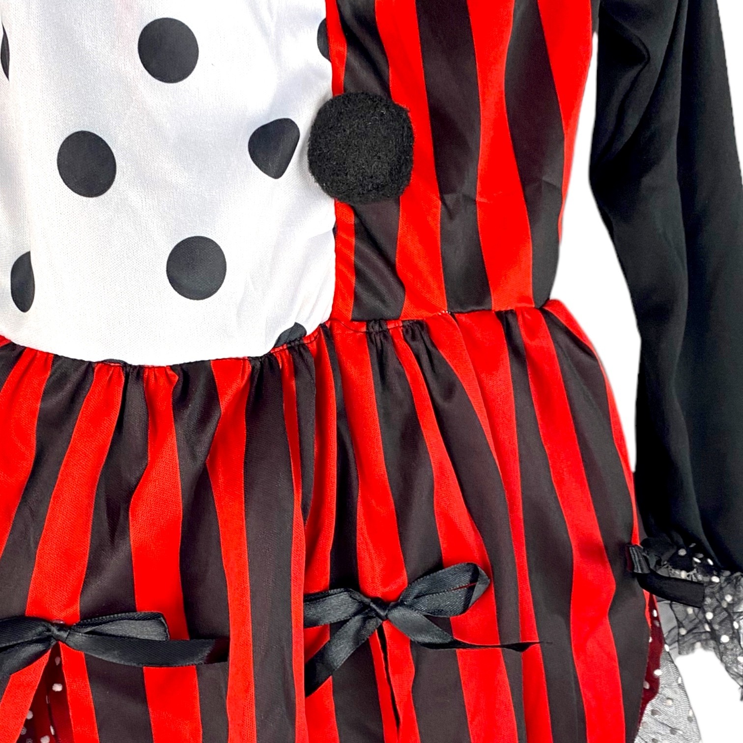 Strój składa się z sukienki łączącej czerwono-czarne pasy i czarno-białe grochy, ozdobionej kokardkami i warstwą tiulu w kropki.
