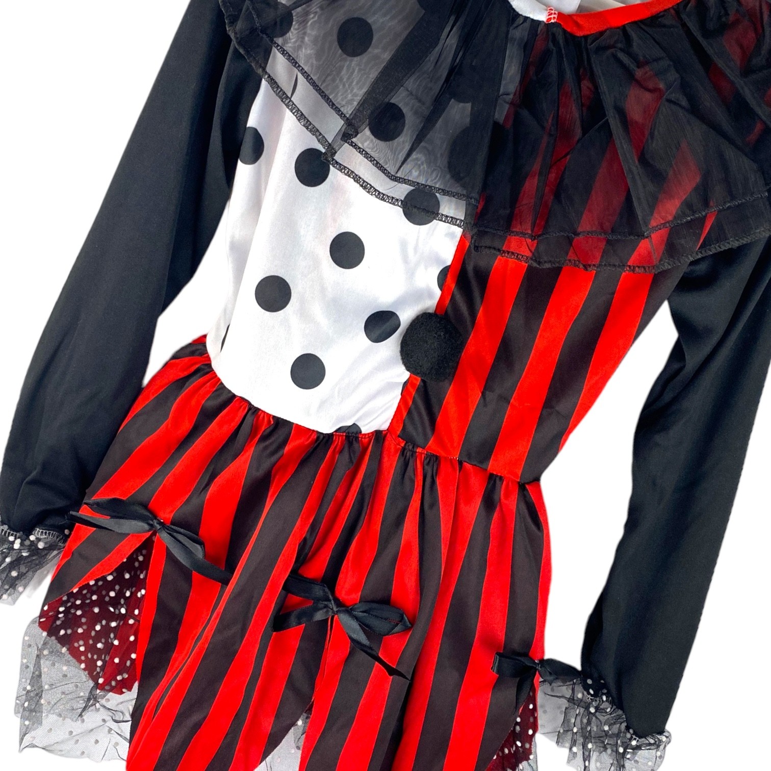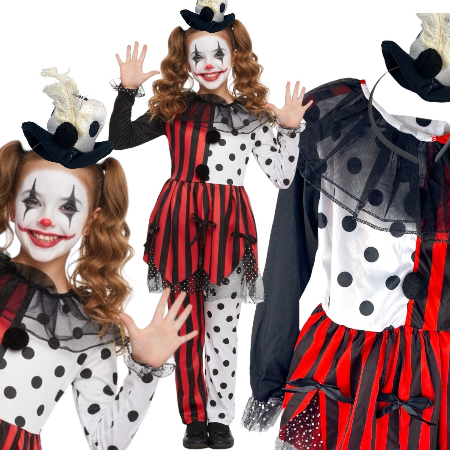 Kolorowy kostium klauna z opaską i mini kapelusikiem to idealne przebranie na Halloween lub bal! Sukienka w paski i grochy z tiulem i kokardkami zachwyci każdą małą artystkę cyrkową.