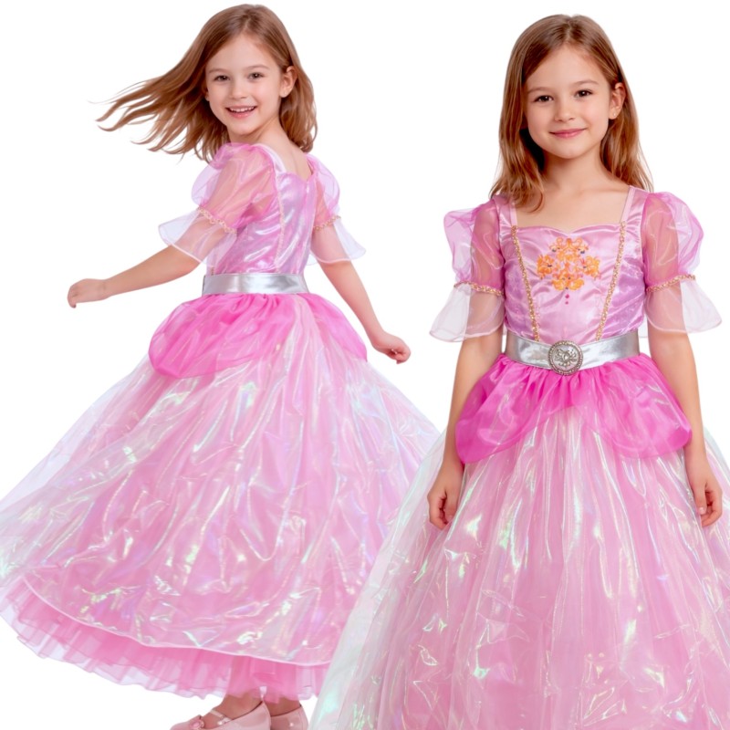 Spełnij marzenie swojego dziecka, pozwalając mu wcielić się w postać różowej księżniczki. Ta bajkowa sukienka wykonana jest z najwyższej jakości materiałów, łącząc różowy tiul perłowy i satynę. Dodatkowe zdobienia złotym nadrukiem dodają jej wyjątkowego uroku. Sukienka jest na podszewce, co zapewnia komfort noszenia.