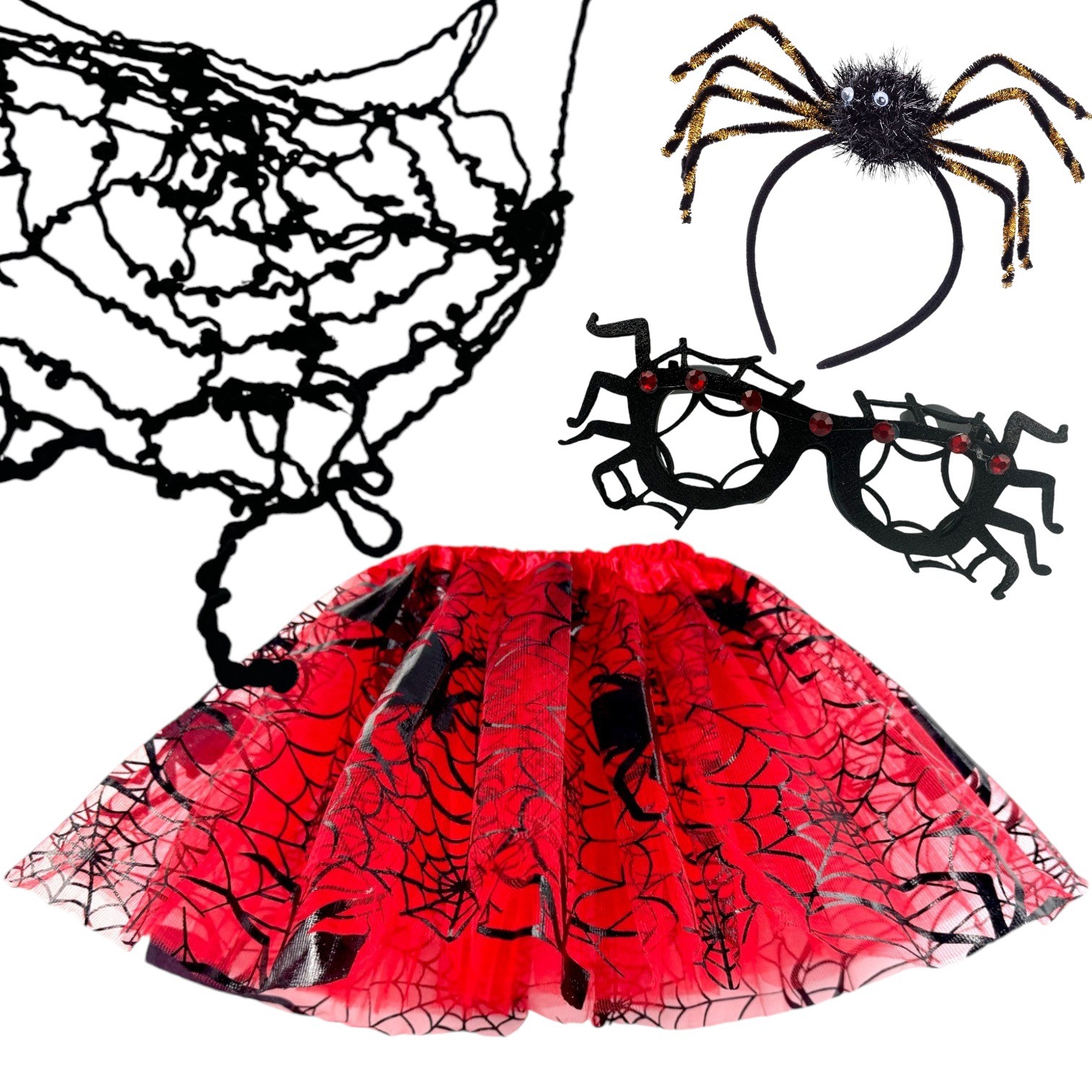 Zestaw składa się z Tiulowej spódniczki w pajęczyny, Opaski z pająkiem, Okularów w kształcie pajęczyn oraz pluszowej pajęczyny.