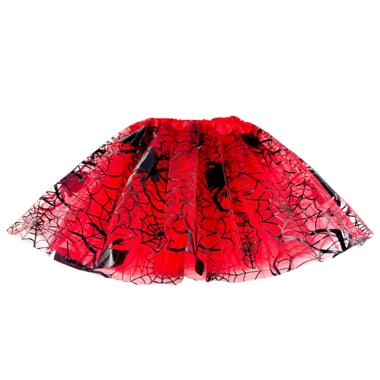 Efektowna czerwona spódniczka pokryta czarnym wzorem pajęczyn i pająków doda każdej stylizacji wyjątkowego, gotyckiego charakteru. Tiulowy materiał zapewnia lekkość i wygodę, a elastyczna gumka w pasie gwarantuje dopasowanie do różnych rozmiarów. Spódniczka nie posiada podszewki. Warto założyć pod nią rajstopy lub legginsy dla większego komfortu.