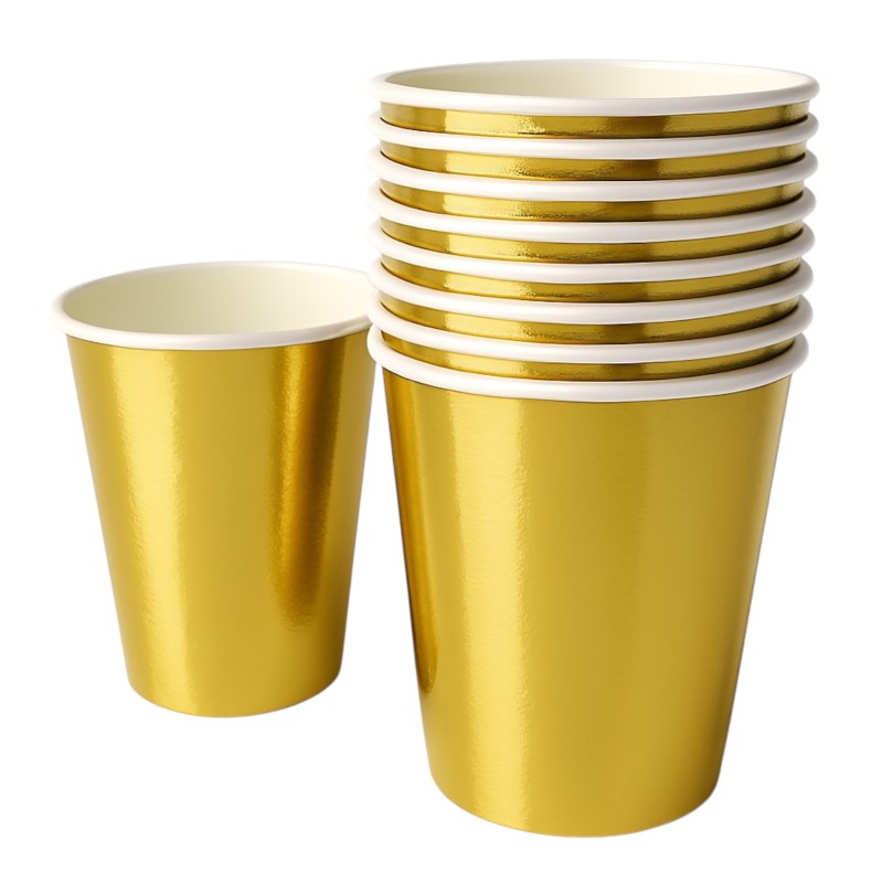 Eleganckie złote kubeczki papierowe, idealne na każdą okazję. W zestawie 10 sztuk o pojemności 250 ml. Doskonałe na urodziny, wesela czy inne uroczystości, wprowadzając odrobinę blasku do Twojej imprezy.