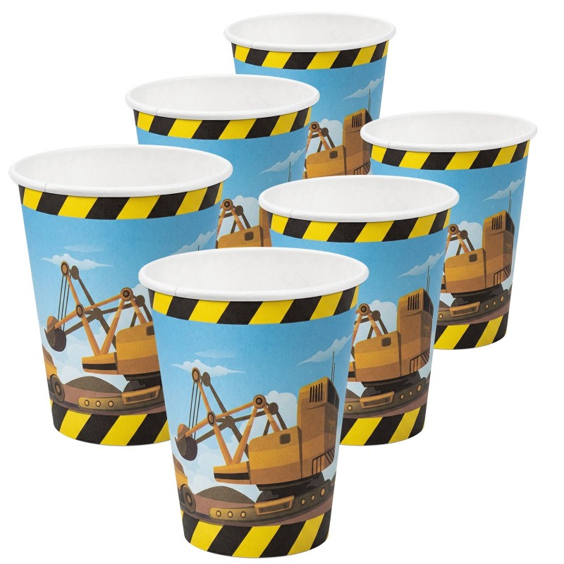 Papierowe kubeczki z motywem koparki i dźwigu, idealne na urodziny małego fana budowy. Zestaw 6 sztuk o pojemności 250 ml, w żywych kolorach i z pasem ostrzegawczym w żółto‑czarne paski. Praktyczne, jednorazowe i efektowne.