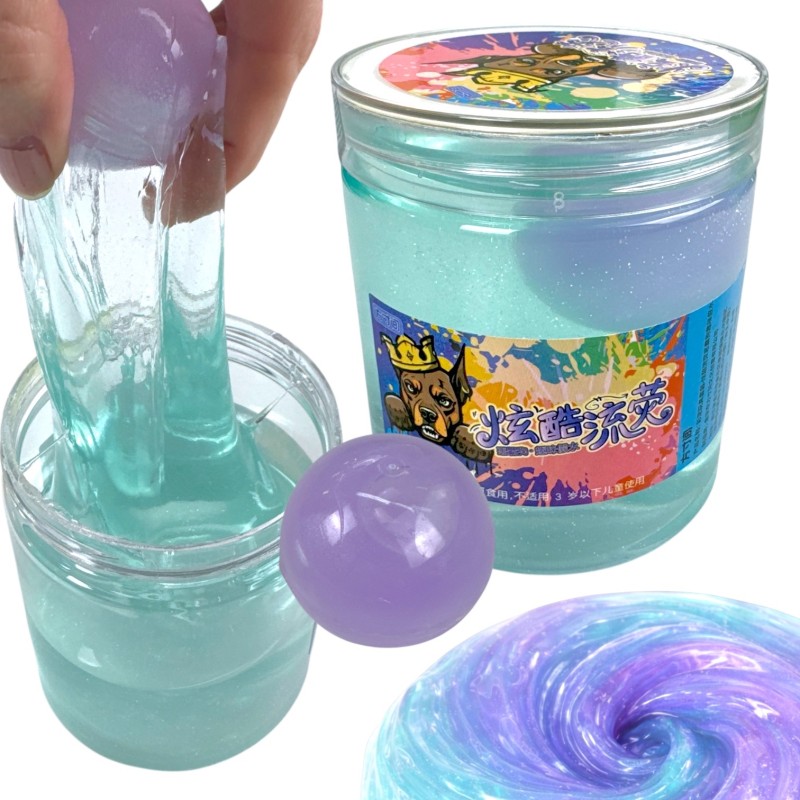- kolory: turkusowo-przezroczysty slime i fioletowa kulka z galaktycznym efektem