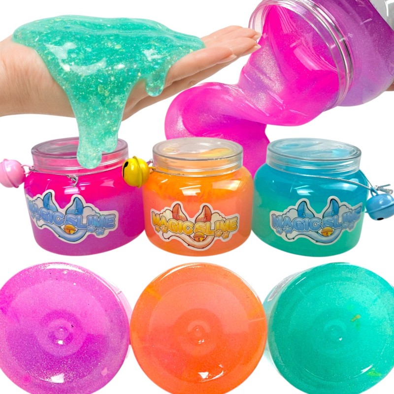 Zestaw 3 slime w słoiczkach z metalowym dzwoneczkiem. Kolorowa, miękka masa plastyczna zachęca do ugniatania i rozciągania, a delikatny dźwięk dzwoneczka dodaje zabawie uroku. Idealny prezent dla dzieci i urozmaicenie przyjęć.