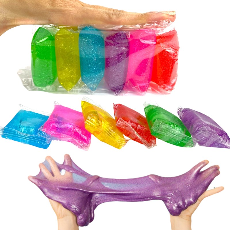 Kolorowy zestaw slime glitter w 6 saszetkach. Błyszcząca, rozciągliwa masa plastyczna idealna do zabawy sensorycznej, kreatywnych eksperymentów i jako drobny upominek dla dzieci.