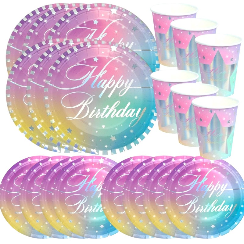Tęczowy zestaw urodzinowy, który rozświetli każde przyjęcie. W komplecie 14 talerzyków i 6 kubków. Idealny do stworzenia magicznej atmosfery.