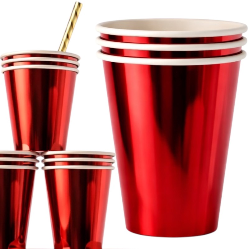 Zestaw 12 papierowych kubeczków Nataluna w metalicznym czerwonym kolorze. Idealne na urodziny, święta, sylwestra i eleganckie przyjęcia. Jednorazowe naczynia dekoracyjne, które dodają stołowi błysku i ułatwiają sprzątanie po imprezie.