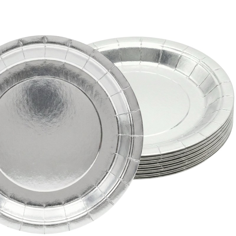 Wprowadź odrobinę elegancji na swoje przyjęcie z naszymi talerzykami papierowymi w kolorze srebrnym. Każdy talerzyk ma średnicę 22 cm, co czyni go idealnym do serwowania przekąsek i deserów. Zestaw zawiera 8 sztuk, co sprawia, że jest doskonały na małe i średnie przyjęcia.