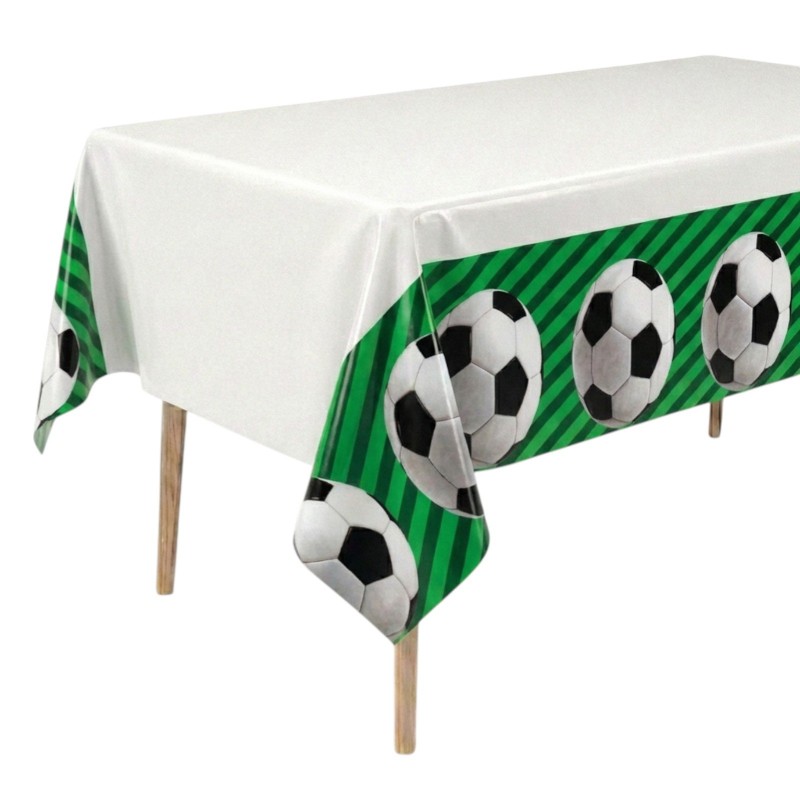 Sportowy klimat od pierwszego spojrzenia. Jednorazowy obrus z motywem piłki nożnej zamieni zwykły stół w mini stadion. Białe pole na środku pięknie eksponuje przekąski, a zielone pasy z dużymi piłkami na bokach tworzą wyrazistą dekorację.