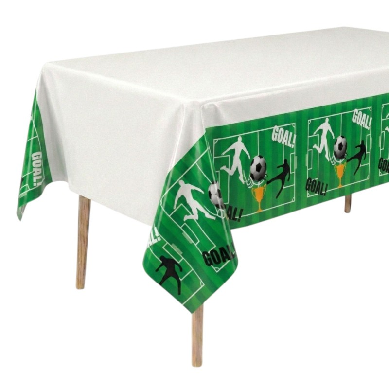 Obrus imprezowy z motywem piłki nożnej to prosty sposób, aby zamienić zwykły stół w mini stadion. Zielone boki przypominają murawę, a grafiki piłkarzy, piłki i pucharu od razu budują sportowe emocje. Górna część pozostaje jasna, dzięki czemu przekąski i dekoracje są dobrze wyeksponowane.
