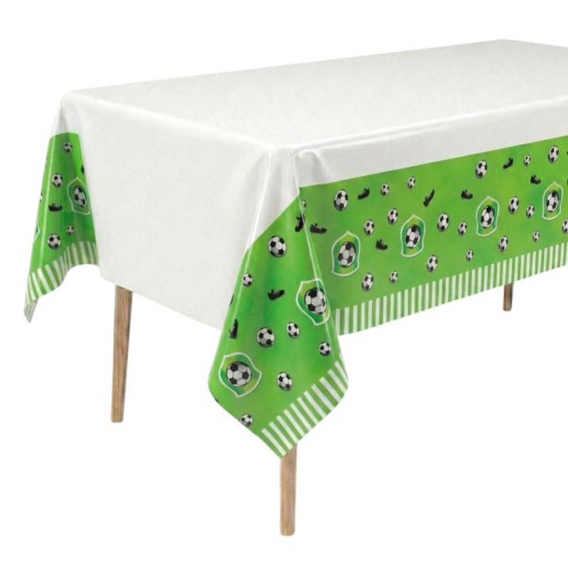 Jednorazowy obrus z motywem piłki nożnej i korków. Idealny na urodziny małego piłkarza, oglądanie meczu czy tematyczne przyjęcie. Chroni stół i tworzy sportowy klimat bez wysiłku.