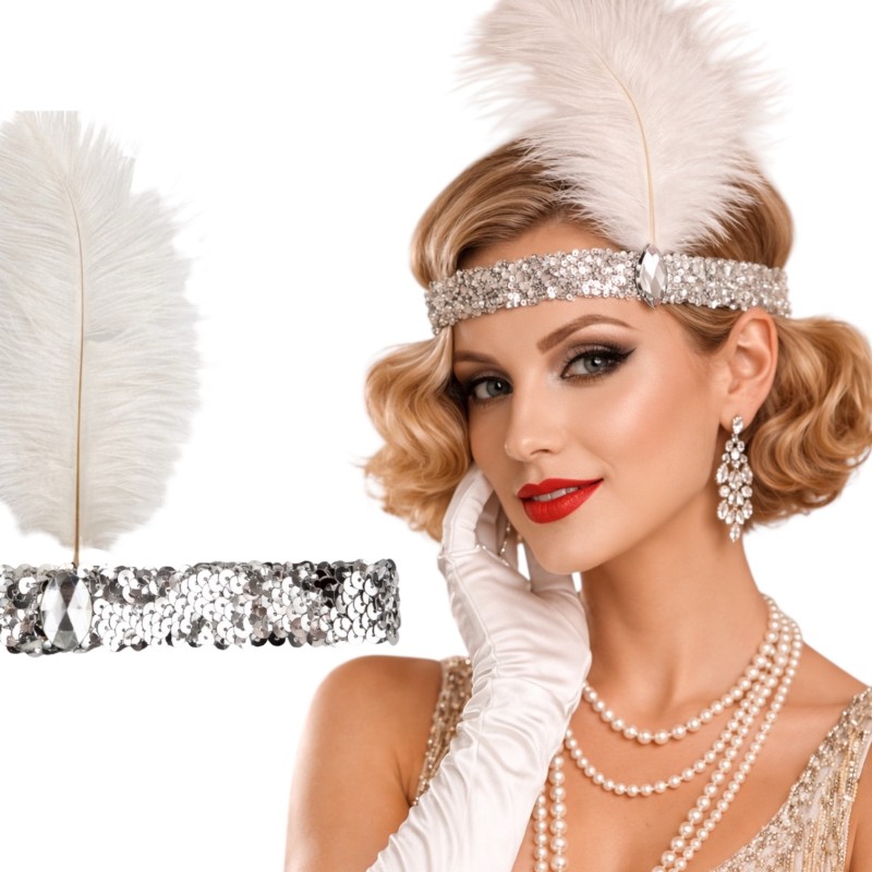 Dodaj swojej stylizacji odrobinę luksusu i błysku dzięki naszej opasce z piórem i cekinami. Doskonały wybór dla każdej miłośniczki mody retro!