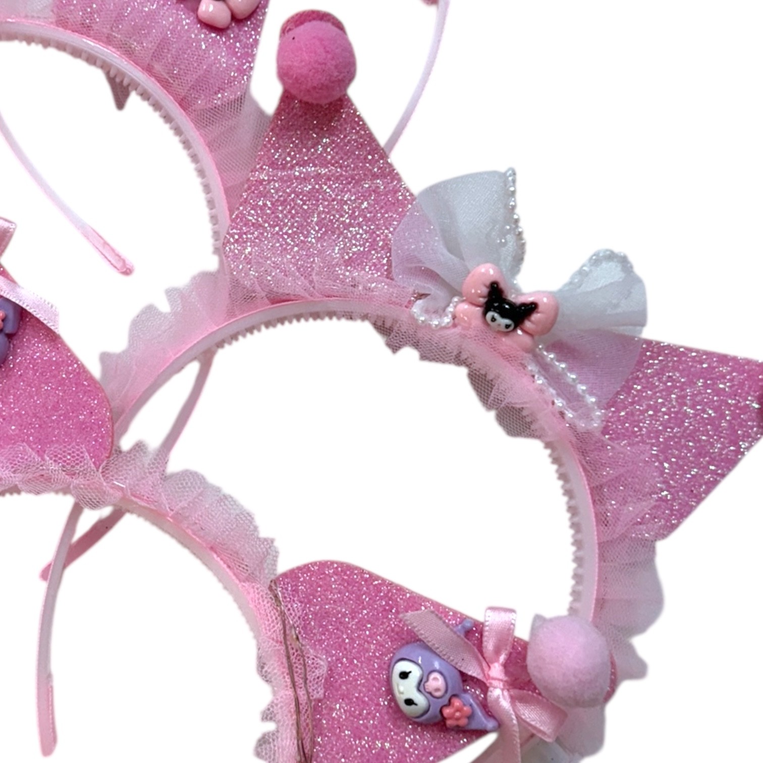 Wykonana w delikatnych odcieniach różu i fioletu, opaska przyciąga uwagę dzięki połyskującym elementom, tiulowym ozdobom oraz błyszczącej koronie, która dodaje jej królewskiego charakteru. Z boku znajduje się figurka Kuromi, która podkreśla wyjątkowy design.
