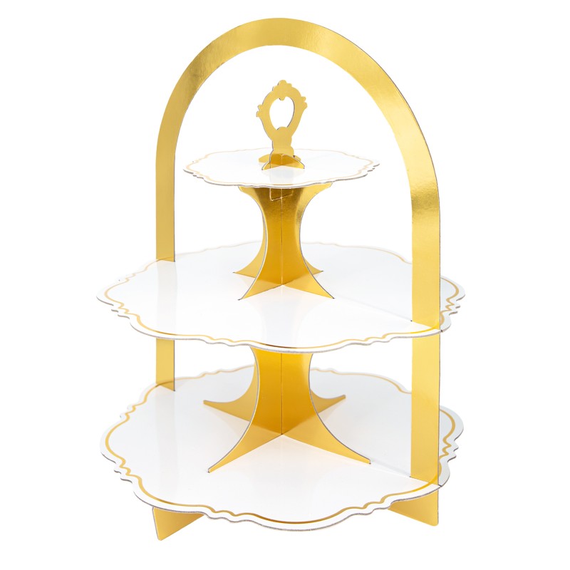 Elegancka biało złota patera trzy poziomy. Idealna na babeczki, ciastka i mini deserki. Doda stołowi szyku na komunii, urodzinach czy przyjęciu w stylu glamour.