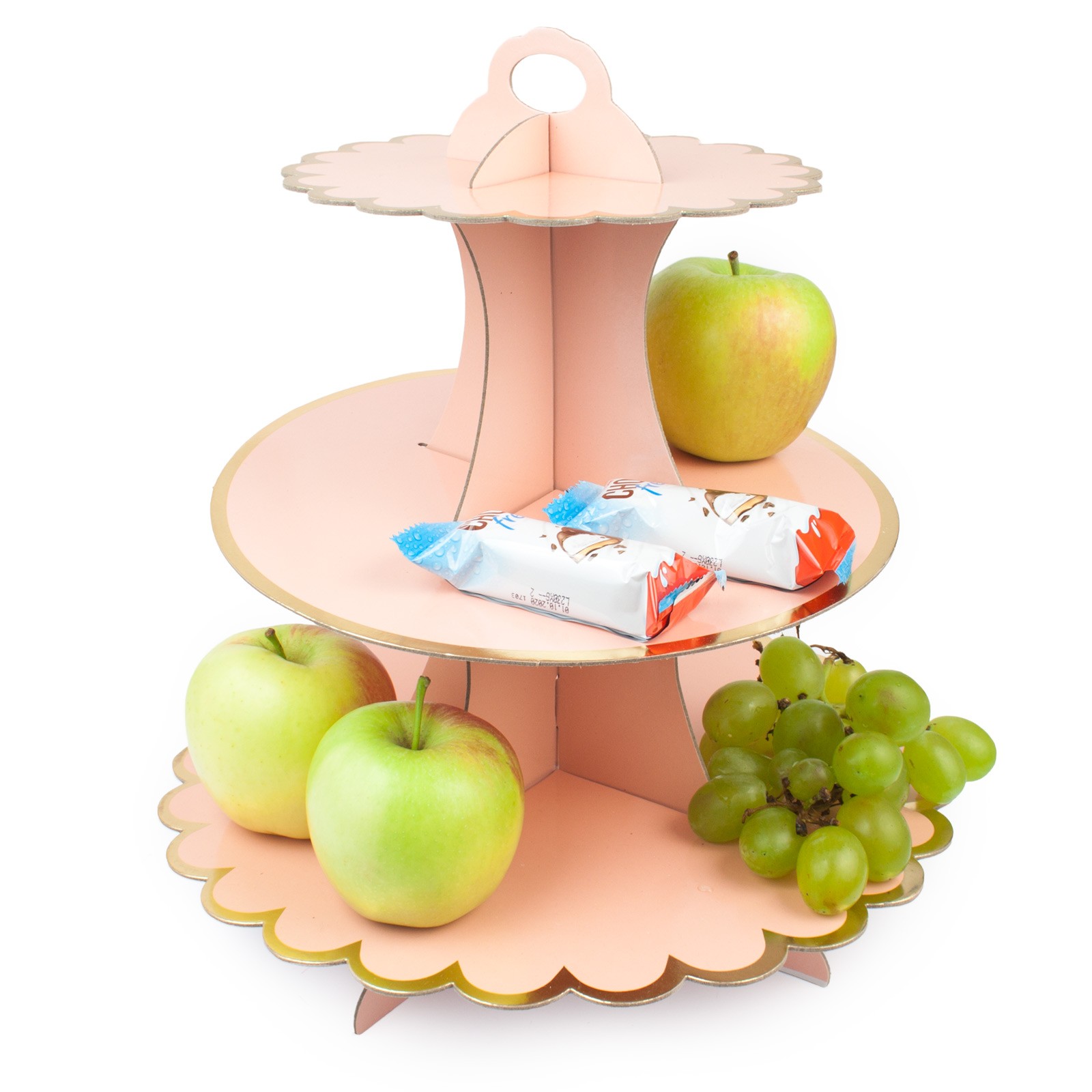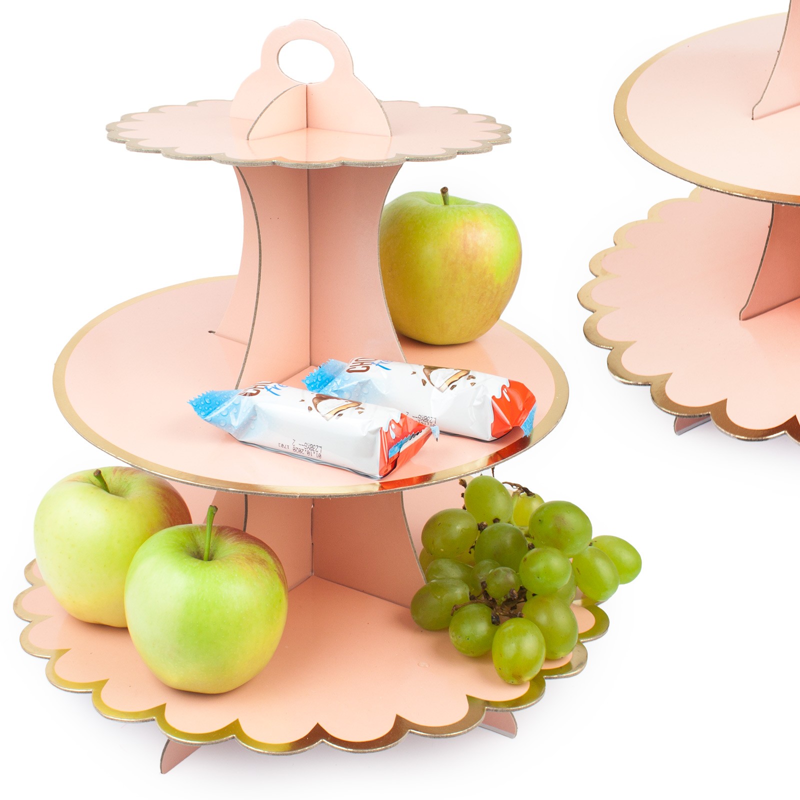 Trzypoziomowa patera z grubej tektury w pudrowym różu ze złotym wykończeniem. Idealna na słodki stół, owoce, babeczki i przekąski na urodziny, roczek, komunię czy ślub.