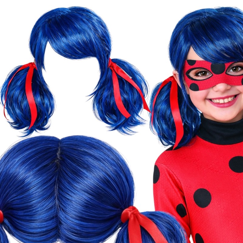Peruka w stylu Biedronki z niebieskimi włosami i czerwonymi wstążkami. Idealna do kostiumów super bohaterek, dodaje uroku i stylu każdej stylizacji.