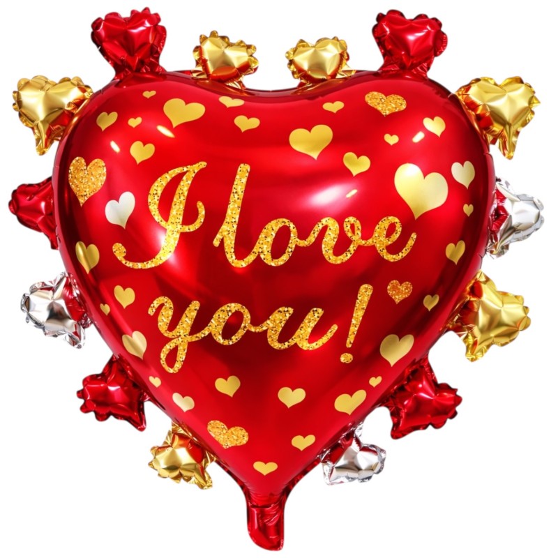 Efektowny balon foliowy w kształcie serca z napisem „I Love You”, ozdobiony złotymi i czerwonymi mini-serduszkami. Wymiary 64 cm – idealny na Walentynki, rocznice i romantyczne okazje.
