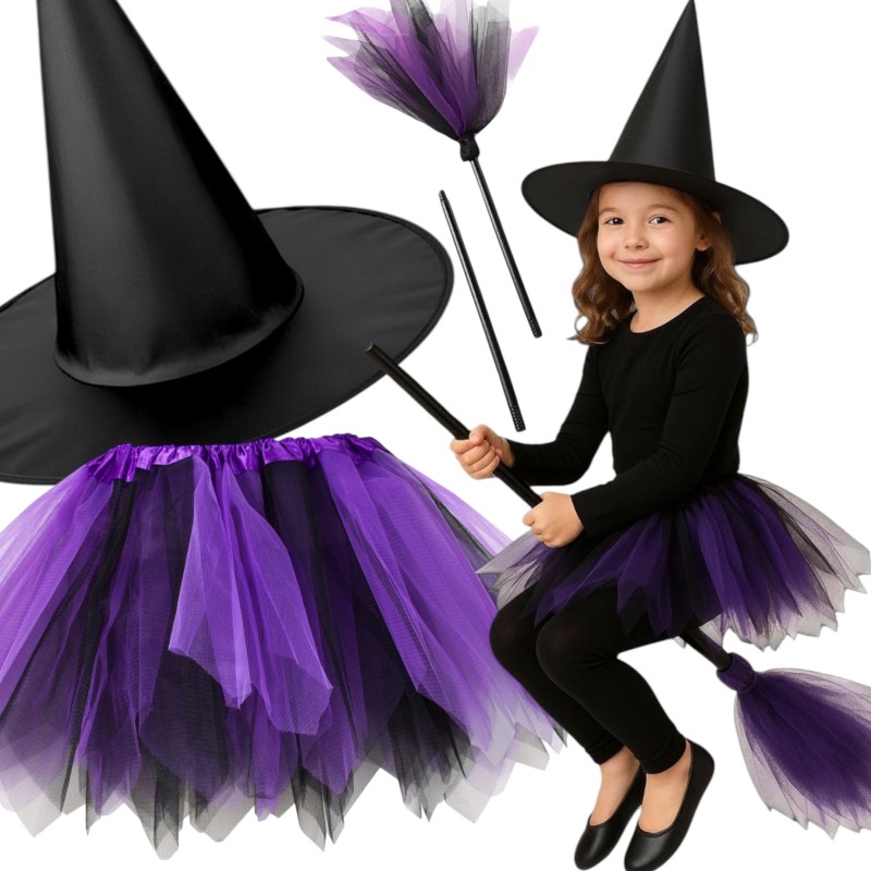 Uroczy strój wiedźmy dla dziewczynek, idealny na Halloween. Zestaw zawiera kapelusz, fioletowo-czarną spódniczkę tutu i składaną miotłę. Pasuje na wiek 3-8 lat. Spódniczka z elastyczną gumką, bez podszewki.