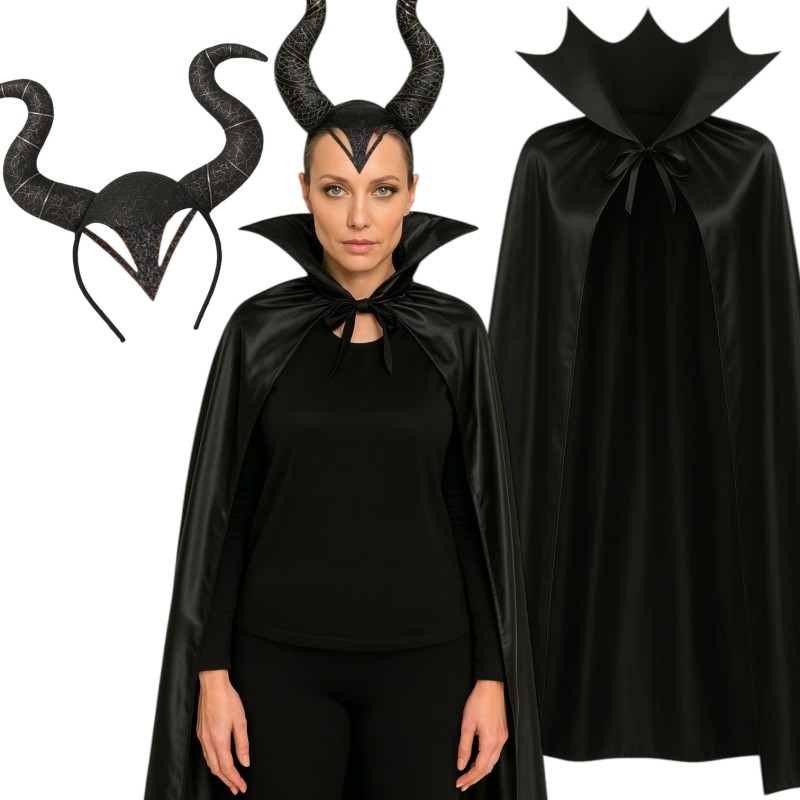 W skład zestawu wchodzi elegancka czarna peleryna oraz dopracowana w szczegółach opaska z rogami.