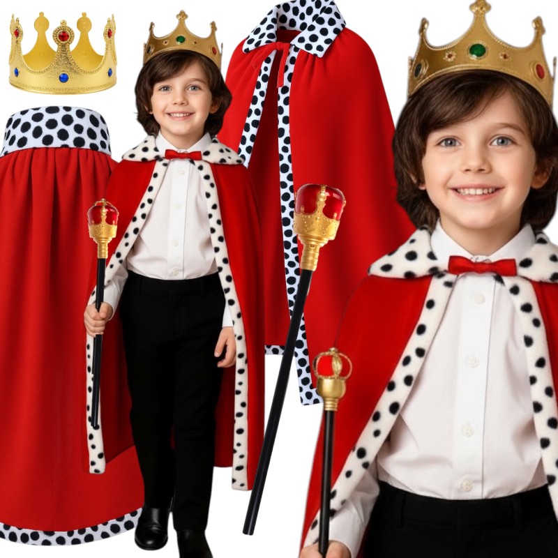 Elegancki kostium króla na jasełka dla dzieci. Zestaw zawiera pelerynę 80 cm, regulowaną koronę i 42 cm berło. Idealny dla dzieci w wieku 5-10 lat.