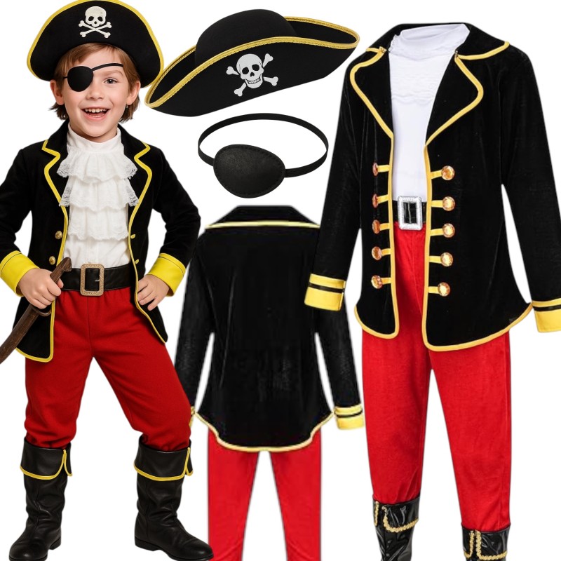 Kostium pirata dla dzieci z czerwonymi spodniami, frakiem, kapeluszem, paskiem, opaską na oko i żabotem. Realistyczny design i wygoda. Idealny na bale i przedstawienia.