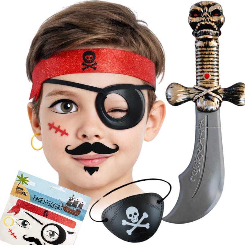 Zestaw pirata z interaktywnym mieczem, opaską na oko i tatuażami. Idealny na przyjęcia i zabawy. Miecz wydaje dźwięki i ma funkcję włączania i wyłączania.