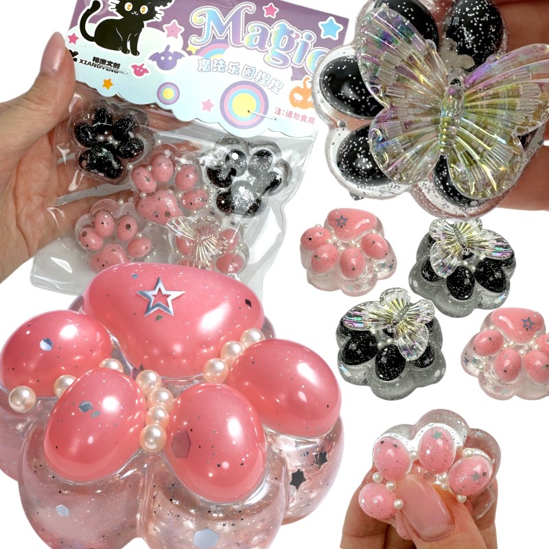 Zestaw 5 gniotków w kształcie kociej łapki i motylka. Sprężyste, mieniące się, idealne na prezent. Ze względu na małe elementy, używać w obecności dorosłych.