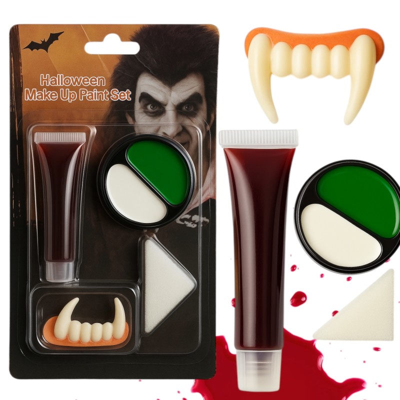 Zestaw do makijażu Halloween z gumowymi kłami, farbkami, sztuczną krwią i gąbeczką. Idealny do stworzenia strasznego, wampirycznego looku. Sprawdzi się na każdej imprezie tematycznej.