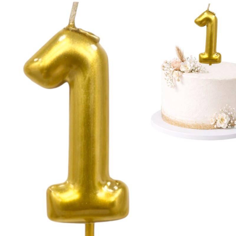 Elegancka świeczka urodzinowa w kształcie cyfry, w kolorze złotym. Idealna na roczek czy inne wyjątkowe okazje. Wysokość 10 cm.