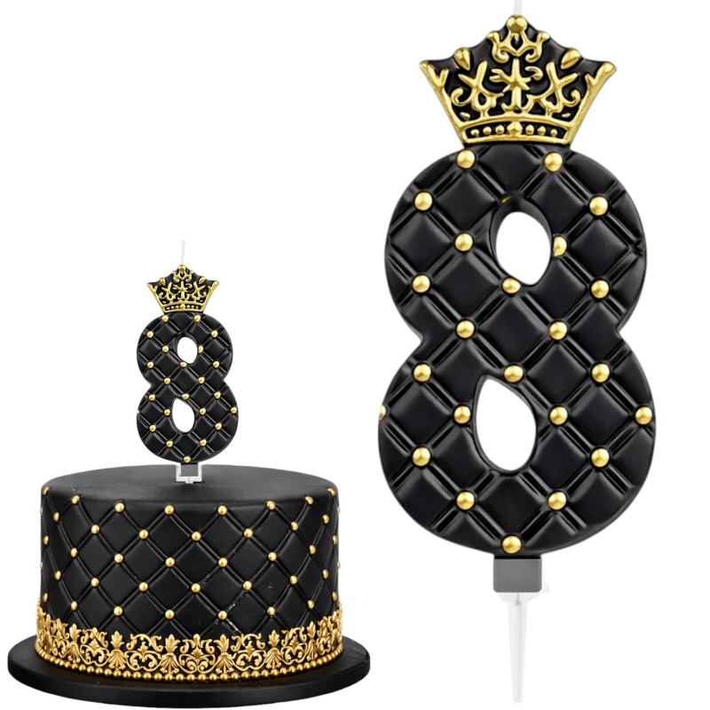 Luksusowa czarna cyfra zachwyca eleganckim, pikowanym wzorem inspirowanym modą haute couture. Złote, wypukłe nity subtelnie połyskują w świetle świec, tworząc efekt ekskluzywnego, królewskiego wykończenia. Całość wieńczy bogato zdobiona złota korona – symbol wyjątkowości i celebracji w wielkim stylu.