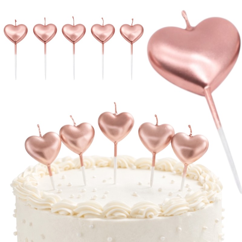 Eleganckie świeczki w kształcie serc w kolorze różowego złota, idealne na tort. Zestaw zawiera 5 sztuk, które dodadzą blasku każdej uroczystości.