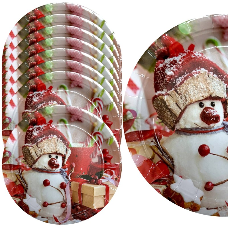 Świąteczne talerzyki papierowe z uroczym bałwankiem, idealne na zimowe przyjęcia. Zestaw zawiera 8 sztuk, każdy o średnicy 22 cm. Dodaj świątecznego klimatu do Twojego stołu.